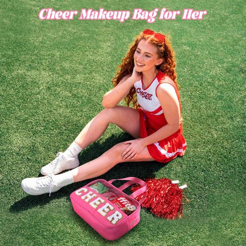 BuyCard Cheer Chenille Letter Bags Clear Makeup Bag, Cheerleader Gift Cosmetic Bag for Travel Zipper Pouch with Handle Cheer Accessories, Nylon & PVC Waterproof Toiletry Organizer Bag for Women Girls