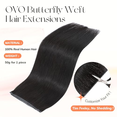 Black Hair Extensions OVO Double PU Weft Human Hair Extensions Invisible Flat Weft Extensions, Natural Looking Seamless Human Hair Extensions for Added Volume & Length