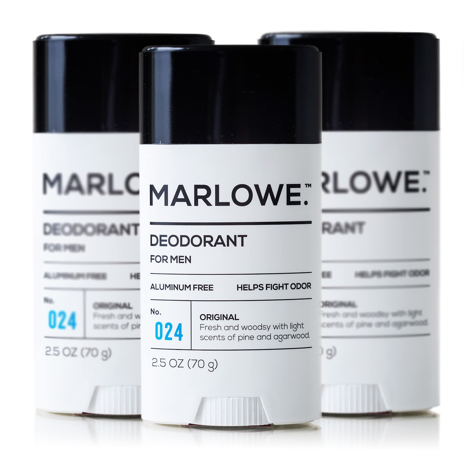 MARLOWE. No. 024 Natural Deodorant for Men 3-Pack | Aluminum Free Stick | Made with Coconut Oil, Shea Butter, Jojoba | Only No-Nonsense Ingredients that Work Best | Fresh & Woodsy Scent