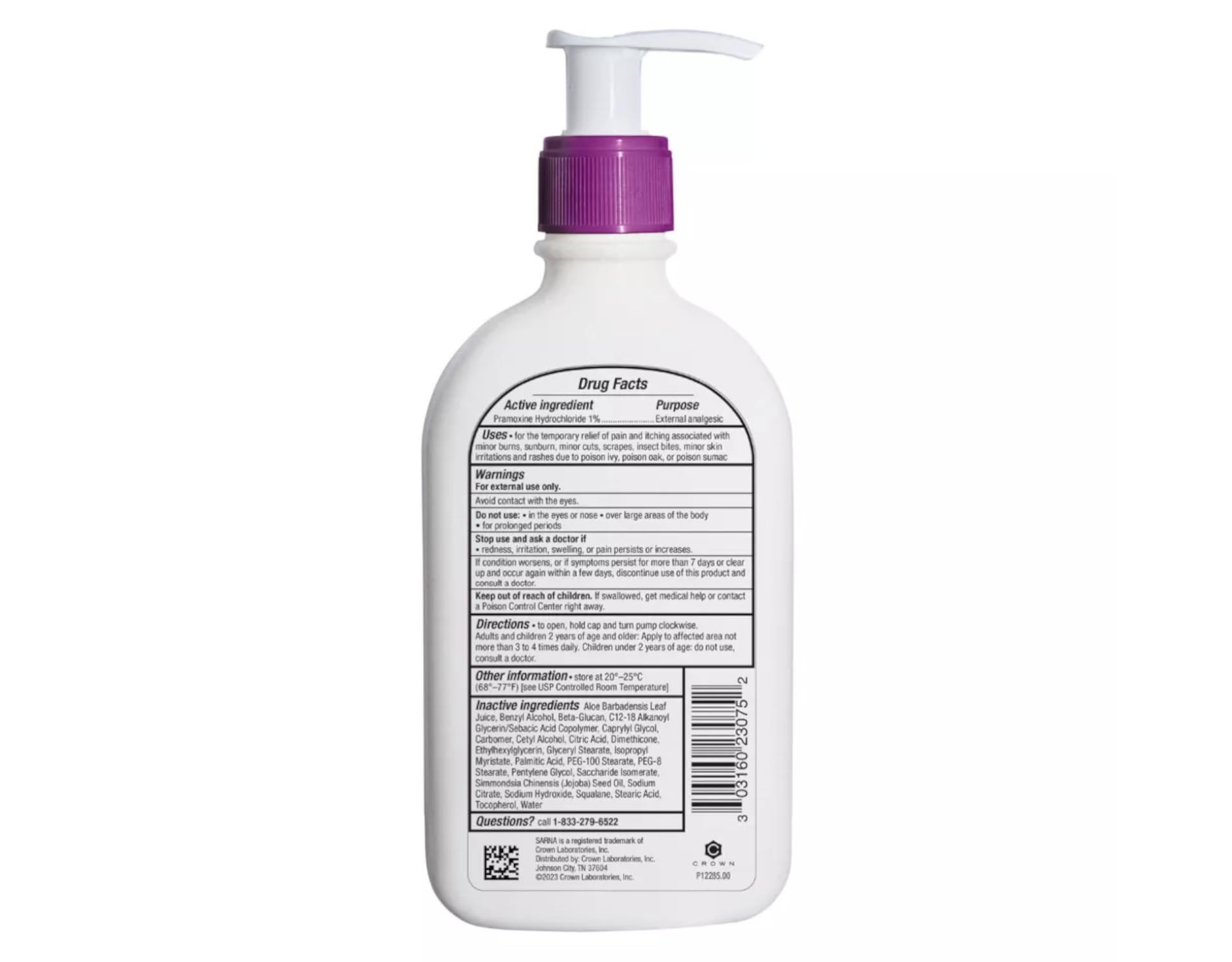 Details: Sarna Sensitive Anti-Itch Lotion contains 1% pramoxine hydrochloride as an external analgesic to temporarily relieve itching associated with minor skin irritations, burns, sunburn, cuts, scrapes, insect bites, and rashes due to poison ivy, poison oak, or poison sumac, it is steroid-free, hypoallergenic, and infused with aloe, squalane, and jojoba oil to soothe and condition the skin, it features a new pump for easy application and is dermatologist recommended.