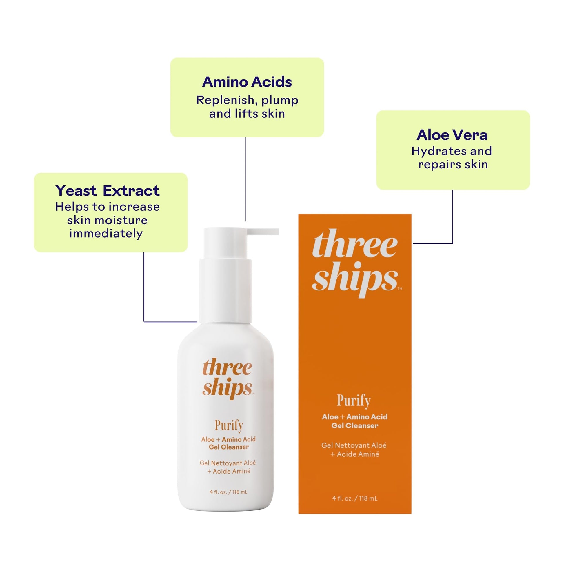 Three Ships - Purify Aloe + Amino Acid Gel Cleanser | Moisturize, Cleanse, Replenish Skin | Cruelty-Free, Vegan, Paraben-Free, Sensitive Skin Safe (4 fl oz | 118 mL)