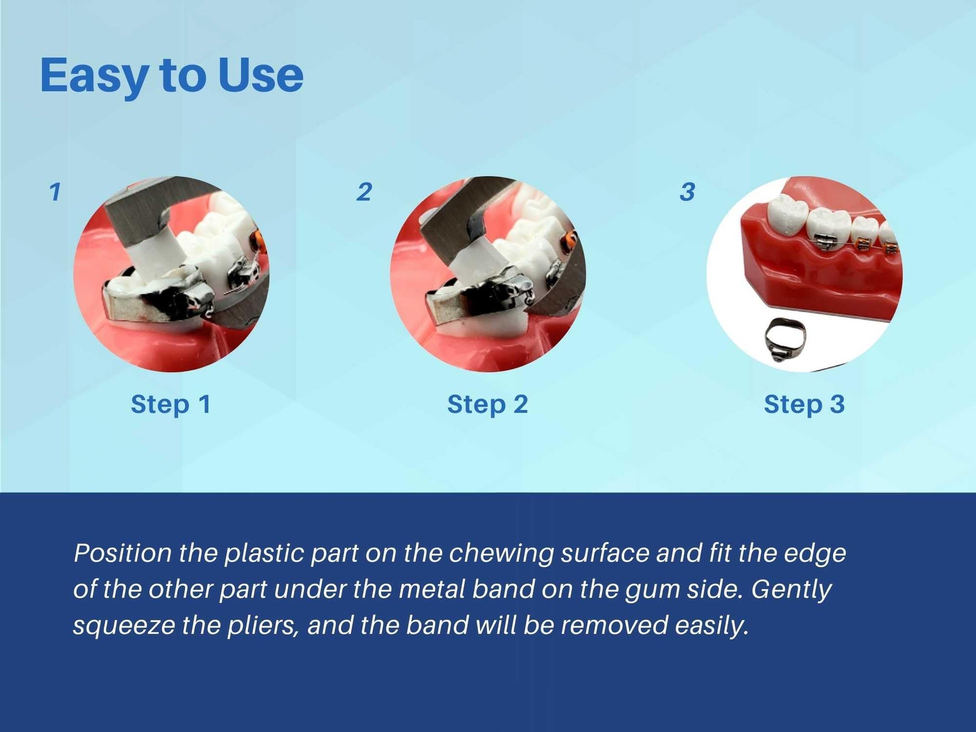 - User-Friendly Application – Simply place the plastic part on the chewing surface, engage the metal band at the gum side, and press the pliers for effortless removal.