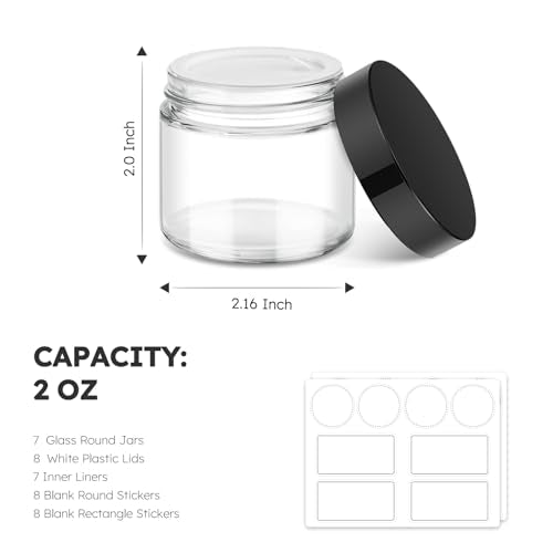 Bumobum 2 oz Glass Jars with Lids, 7 pack Small Jars with White Labels & Inner Liners, Multicolor 60 ml Empty Round Cosmetic Containers for Sample, Powder, Cream, Lotion, Spice