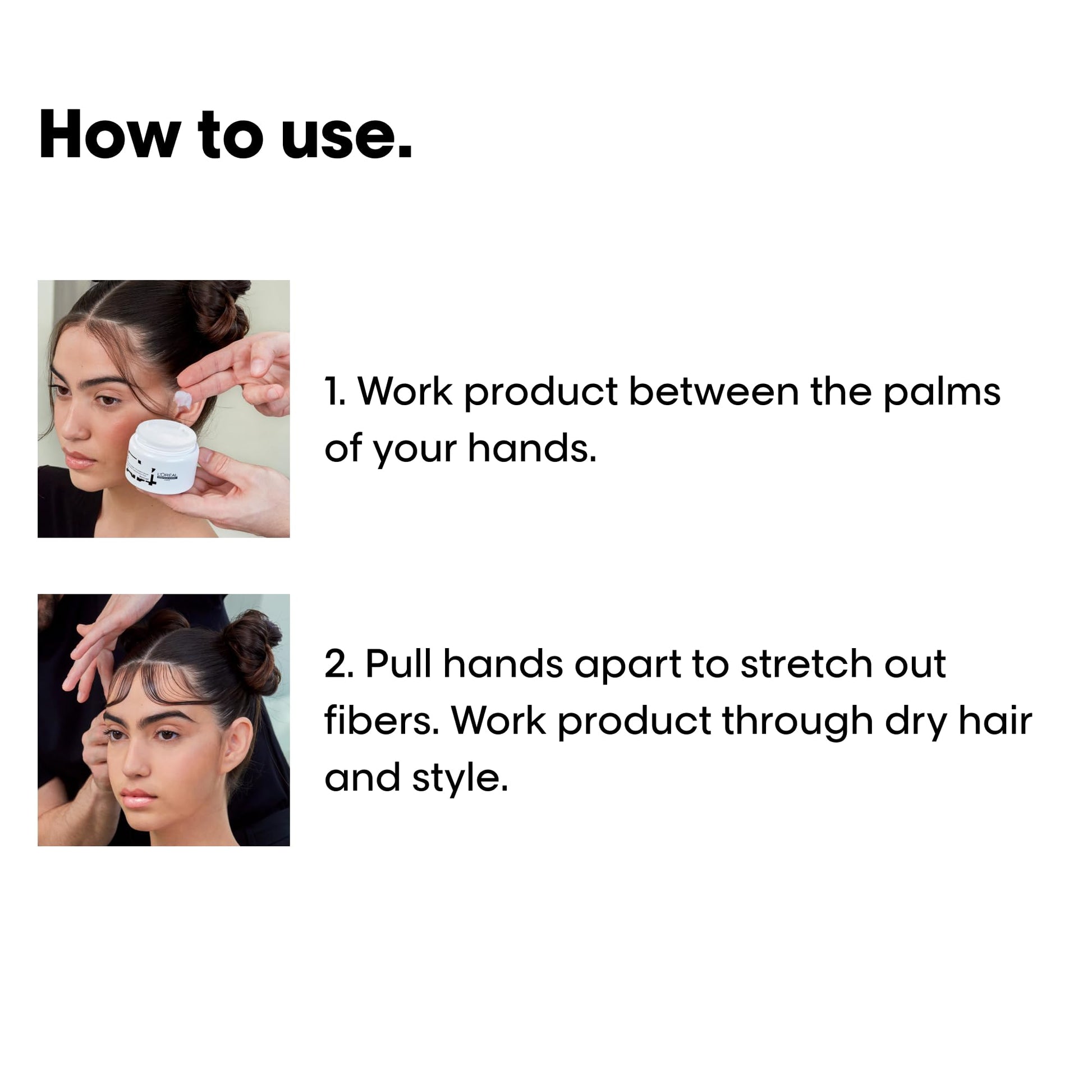 - Suggested Use: On dry hair, work product between the palms of the hands. Pull hands apart to stretch out fibers. Run through hair.