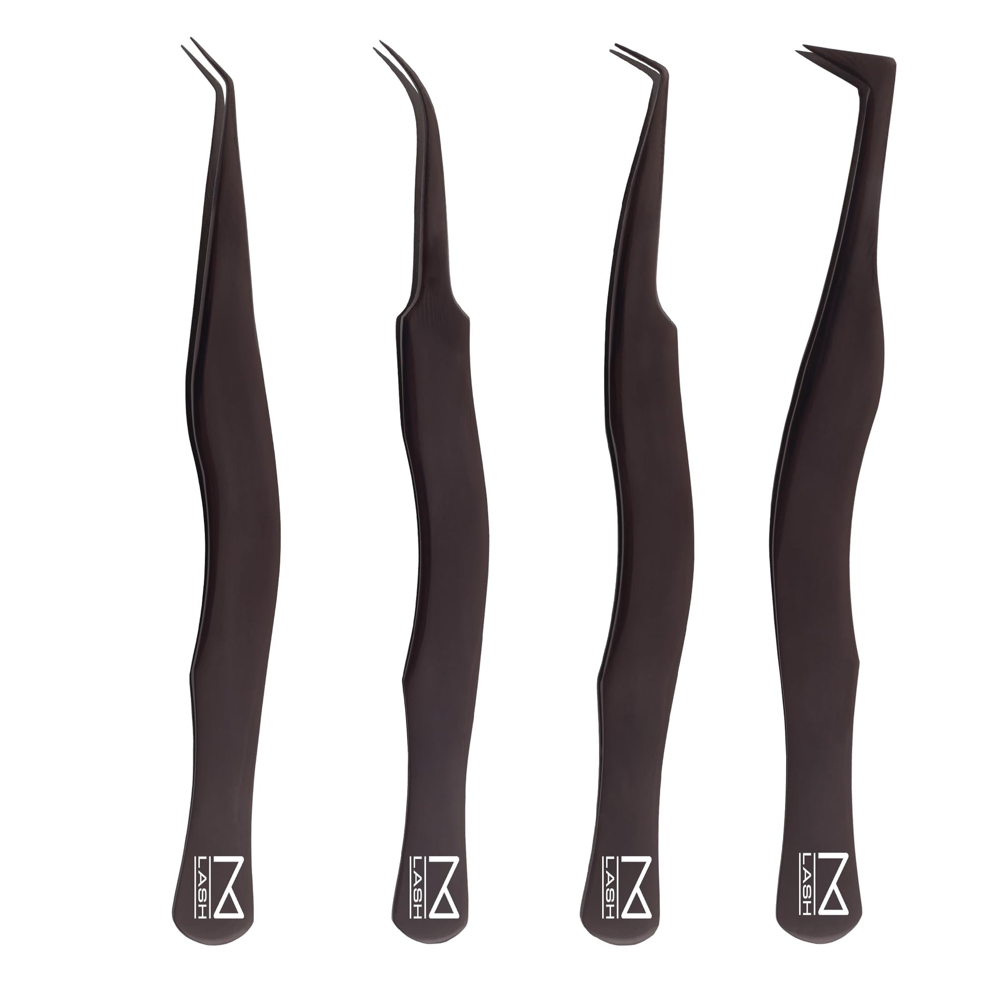 M LASH Eyelash Tweezers for Eyelash Extensions (Set of 4) - Professional Lash Extension Tweezers - Fiber Tip Lash Tweezers, Japanese Steel, Diamond Grip For Flawless Application (Black)