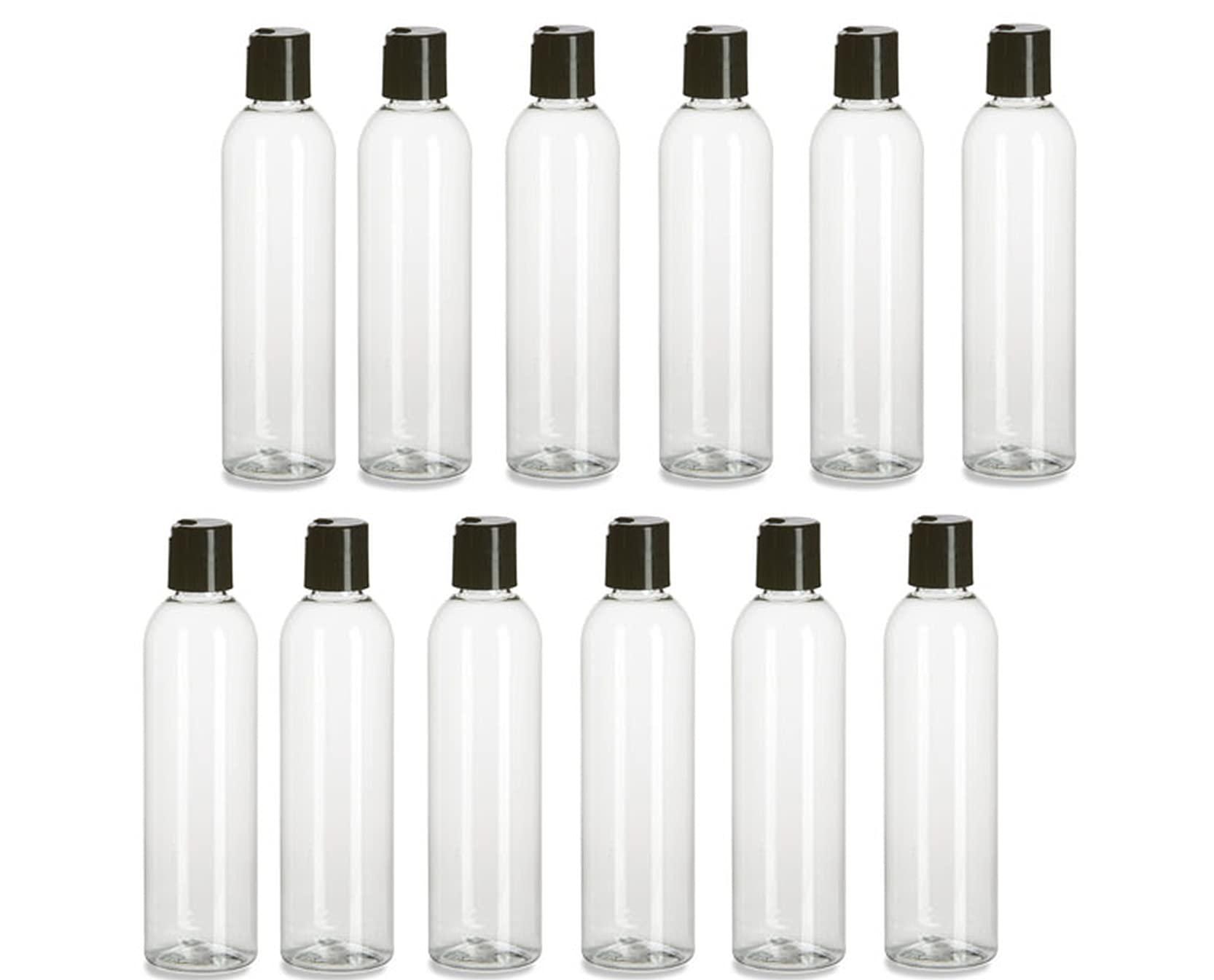 Natural Farms 12 Pack – 8 oz -Clear Cosmo Plastic Bottles – Black Disc Top - for Essential Oils, Perfumes, Cleaning Products