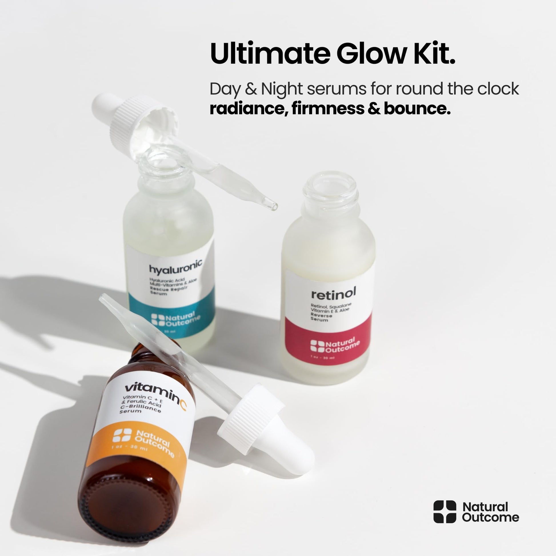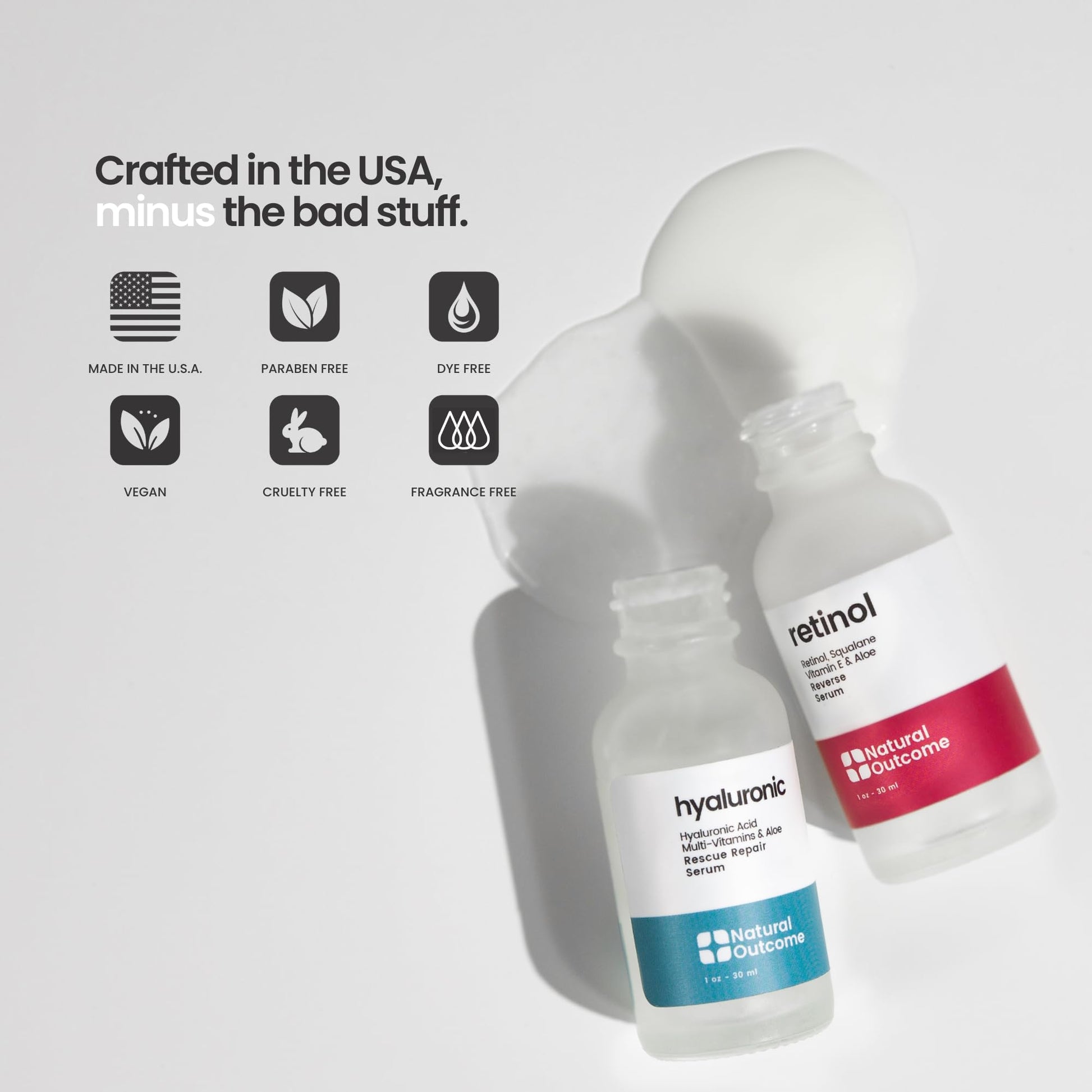 Natural Outcome Hyaluronic Acid, Vitamin C Face Serum and Retinol Facial Serum - Night and Day Anti Aging Facial Serum and Hydrating Serum Set 1 oz Each, Vegan, Cruelty Free & Fragrance Free