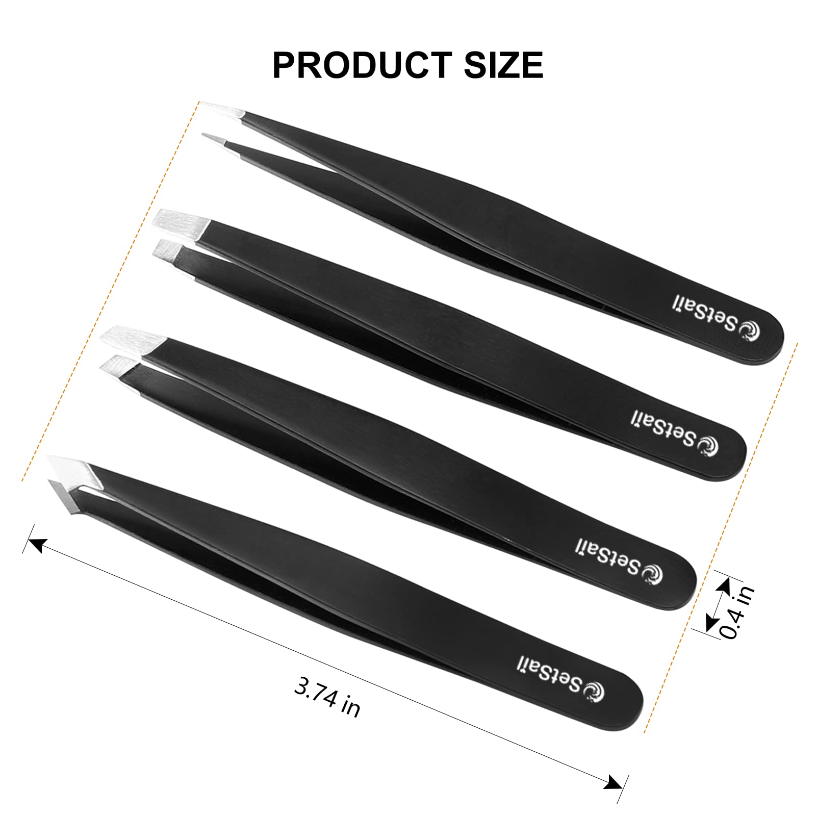 SetSail 4-Piece Tweezers Set, Eyebrow Tweezers Black Stainless Steel Slant, Slanted Pointed, Round Pointed & Flat Tip Tweezers for Precision Grooming for Women & Men