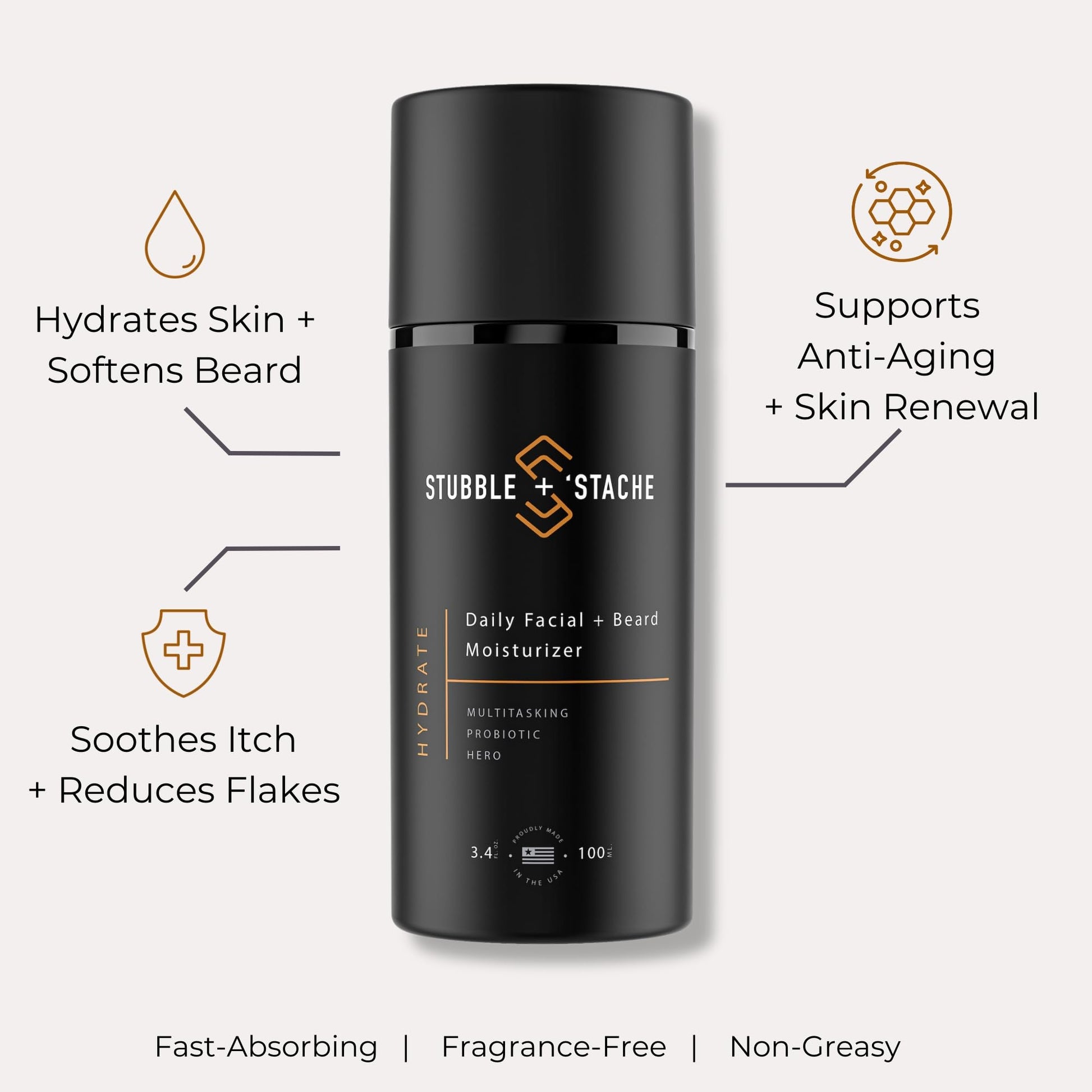 stubble & stache Beard & Face Moisturizer for Men - Hydrating Lotion with Hyaluronic Acid, Niacinamide, Argan Oil, Aloe Vera, Jojoba Oil, & Vitamin A for Dry Skin & Beard Conditioning - 3.4 fl oz
