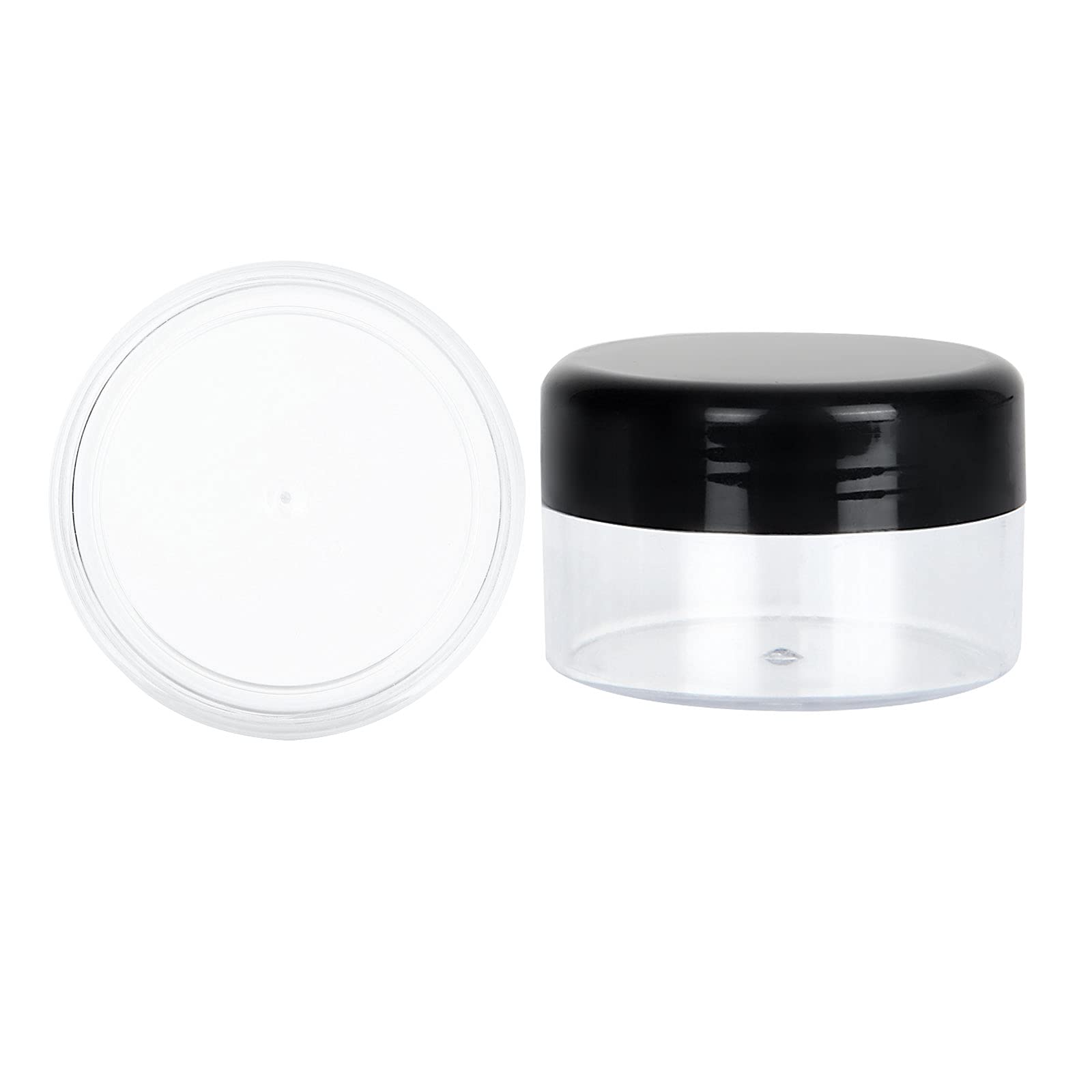 100 pieces sample containers with black lids, which are strong and durable, a daily helper for storing paste, liquid and solid items. Features WIDE MOUTH AND TRANSPARENT Let you more comfortable to figure out and filling 100 PIECES 20G CAPACITY Easily meet the storage needs of a variety of items in your life. REUSABLE ACRYLIC PLASTIC JARS Suitable for storage creams, lotions, make up, cosmetics, lip balm, lip gloss, scrubs, salves, nail accessories, beads, small jewelry and more. Specification: Material: PP+PS Size: 1.65inch×1.1inch Capacity: 20 ml ( 0.67 fl oz )/piece Shape: Round Color: Black Lid with Transparent Clear Bottom Package include: 100 x Empty cosmetic containers