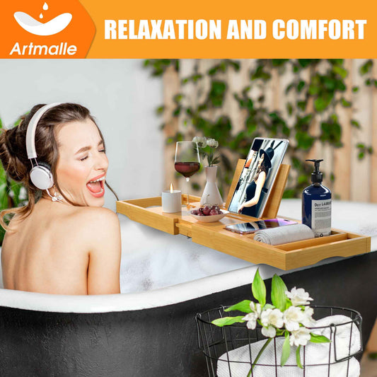 Artmalle Foldable Bathtub Tray for Tub, Bamboo Bathtub Caddy Tray Table with Book Stand for Luxury Bath, Bathroom Accessories for Women Men with Free Soap Dish (Semi-Simple, Natural) (Natural)