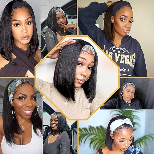 Straight Bob Headband Wig Human Hair None Lace Wigs for Black Women Glueless Short 100% Brazilian Virgin Head Band Easy to Install Half with Free