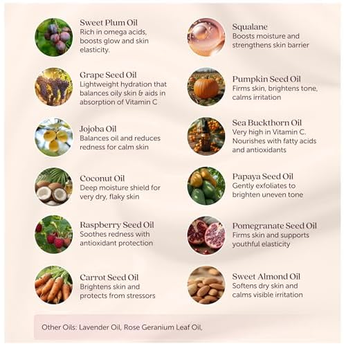 - CLEAN INGREDIENTS WITH BOTANICAL OILS: Formulated with a curated blend of botanical oils?grapeseed oil, sweet almond oil, coconut oil, squalane oil, castor oil, pumpkin seed oil, and jojoba oil. Each oil is selected for its nourishing texture and skin-conditioning benefits, working together to support a soft, vibrant complexion.