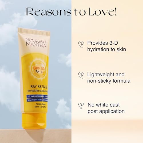 NOURISH MANTRA Ray Rescue Sunscreen/Sunscreen SPF 50/ With Hyaluronic Acid, Aquaxyl, Aloe Vera Extracts & Ashwagandha Extracts/No White Cast, (60 ml (Pack of 1))