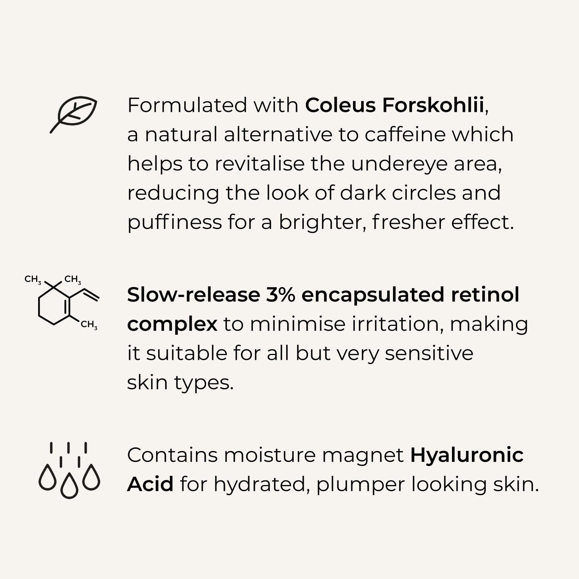 - Contains Slow-release 3% Encapsulated Retinol, Hyaluronic Acid and Coleus Forskohlii to reduce fine lines and wrinkles, hydrate and plump the skin and reduce the look of dark circles and puffiness