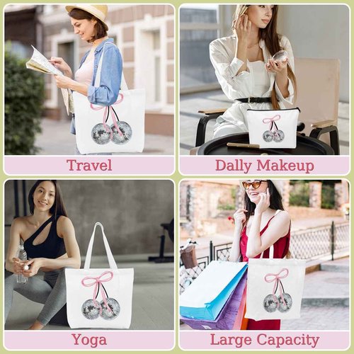 Cute Pink Coquette Bow Cherry Canvas Tote Bag Beach Tote Bag for Women with inner Pocket, Preppy Stuff Gifts for Women Teen Girls Sister Friendship Reusable Shopping Grocery Bags Travel Makeup Bagss