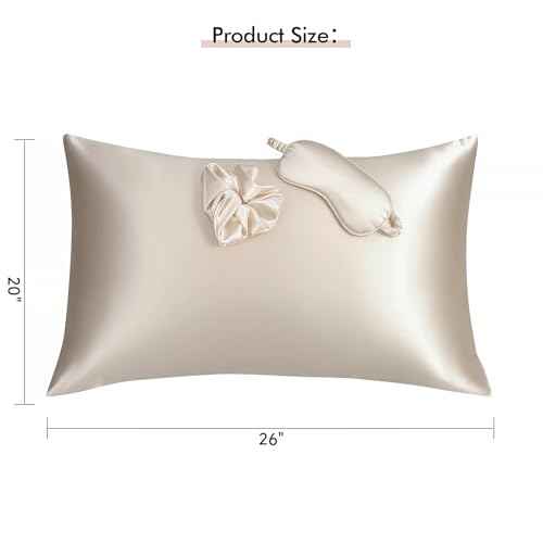Vegan Silk Sleep Set, Vegan Silk Pillowcase with Large Scrunchie and Eye Mask for Hair and Skin, Self Care Essential Satin Night Routine Kit (Champagne Color)
