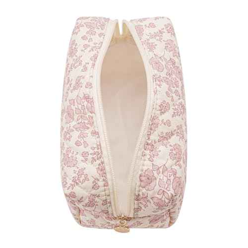 Gleyemor Small Quilted Makeup Bag for Women, Cute Floral Bow Cosmetic Bag, Emergency Bag Travel Toiletry Cotton Pouch Gifts for Girls Her Mom Friend Sister Bridesmaid (Pink Flower)