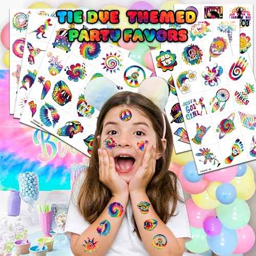 96 PCS Tie Dye 90s 80s Pre-Cut Temporary Tattoos for Kids | Super Cute Themed Birthday Party Favors, Supplies, Decorations, Colorful Fake Tattoo Stickers (multiple)