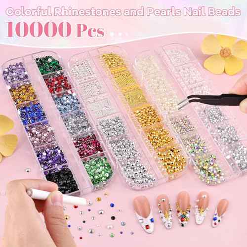 10000Pcs Colorful Nail Rhinestones and Charms for Nail Art, Flatback Nail Pearls and Caviar Nail Beads(Silver+Gold), Bedazzling Rhinestones Jewels Kit Nail Gems Pearl Nail Charms for Manicure Decor