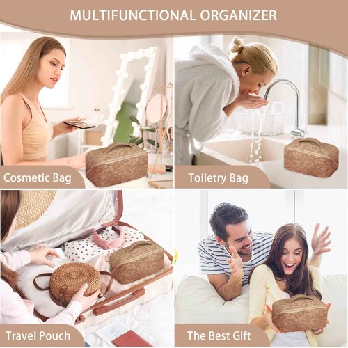 BAKLUCK Large Capacity Travel Cosmetic Bag with Compartment, Waterproof PU Leather Portable Flower Makeup Organizer Bag for Women and Girls - Khaki
