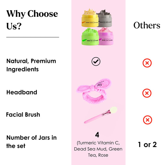 Clay Mask Gift Pack of 4 Jars (400g), Cute Headband & Brush | Clay Face Mask | Turmeric Vitamin C, Green Tea, Rose, Dead Sea Mud | Clay Mask For Face | Christmas Gifts for Women, Gifts for Women