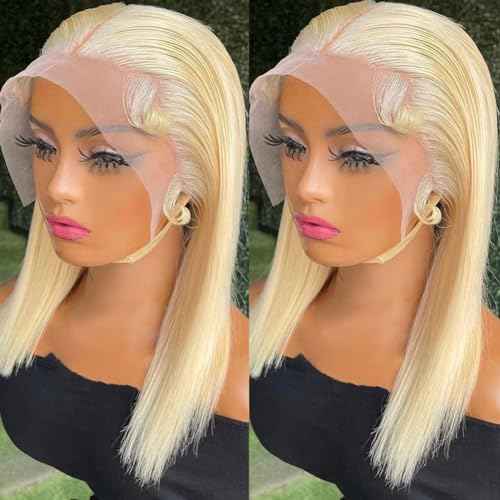DEWELLY 613 Blonde Bob Wig Human Hair 16 Inch Straight Blonde Bob Lace Front Wigs Human Hair Pre Plucked 613 Colored 180% Density 13x4 HD Lace Frontal Short Bob Wigs for Women Glueless with Baby Hair