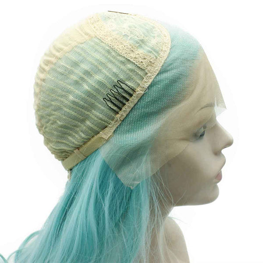 Mxangle Long Wavy Light Blue Half Hand Tied Synthetic Lace Front Wig Fiber Hair Costume Party Wig