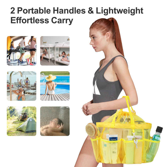 F-color Mesh Shower Caddy Portable with Drawstring - Upgrade Deeper 7 Pockets Dorm Room Essentials for Guys Girls with S Hook, Shower Bag Basket Tote for College Camping Toiletry Bathroom, Yellow