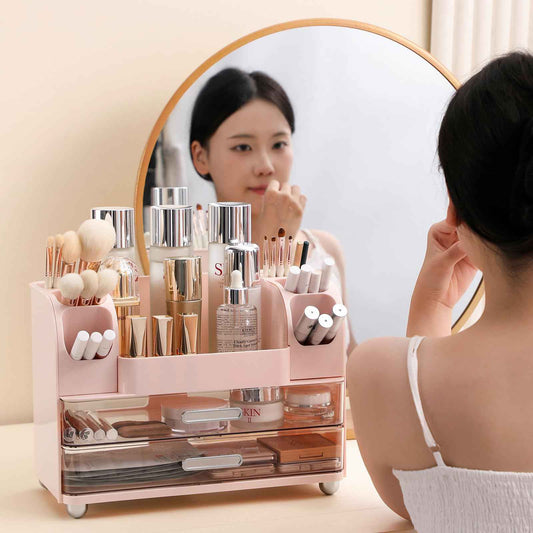 Anyoifax Makeup Organizer Countertop with Large Drawers, Vanity Organizer with Brush Holder, Skin Care Storage for Dresser, Perfume Organizer for Lotion, Lipsitck, Palette, Light Pink