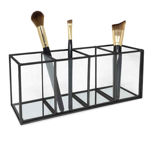 Isaac Jacobs 4-Compartment Organizer- Makeup Brush Holder- Vintage Style Brass and Glass Storage Solution with Mirror Base- Office, Bathroom, Kitchen Supplies and More (Black)