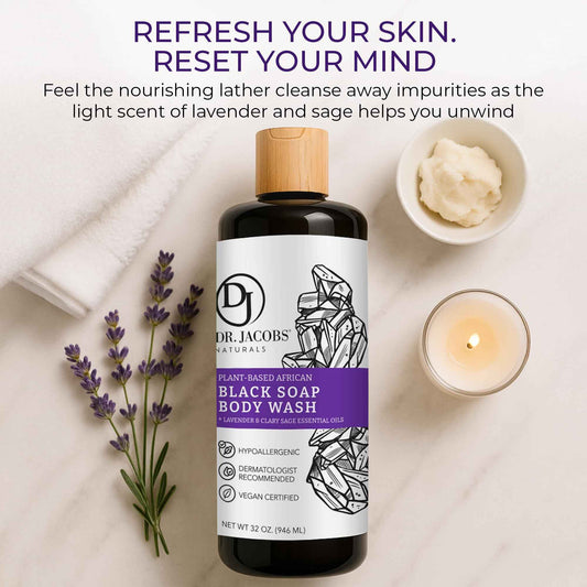 Dr Jacobs Naturals Authentic African Black Liquid Soap with Lavender & Sage Scent All-In-One Face Wash, Sensitive Skin Body Wash, Shampoo, Shaving Soap | Moisturizing and Nourishing Formula 32oz 2pk