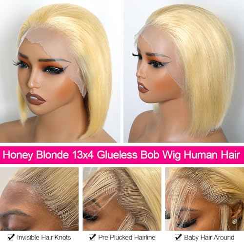 Blonde Bob Wig Human Hair 13x4 HD Lace Frontal Glueless Wigs Human Hair for Black Women 180 Density Pre Plucked 100% Brazilian Virgin Blonde Wigs Human Hair - 10 Inch Skinlike 613 Bob Wig