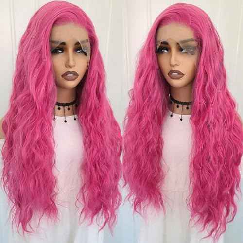 RONGDUOYI Hot Pink Wig Long Wavy Hair Wig Pink Curly Synthetic Lace Front Wig Water Wave Glueless Red Deep Wave Lace Front Wigs for Women Party Cosplay