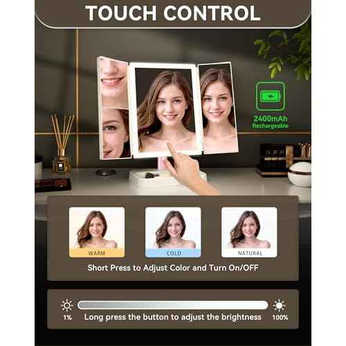 Makeup Mirror with Light, 1X 10X Magnifying Mirror with Lights, 8 inch Rechargeable Lighted Vanity Mirror, Double Sided 360¡Æ Rotation, 3 Colors and Brightness Adjustable Cosmetic Light up Mirror