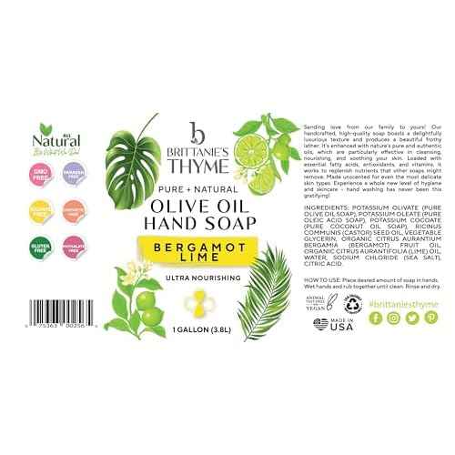 Brittanie's Bergamot Lime Pure Castile Olive Oil Liquid Soap 1 Gallon (128oz) | Face, Body Wash, Dishes, Pets & Laundry | Natural Vegan Sulfate Free, Moisturizing & Refill-Friendly