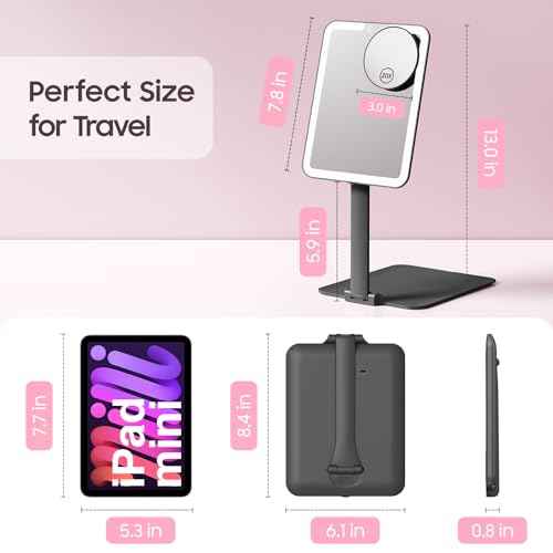 Benbilry Foldable Travel Makeup Mirror with Lights and 20X Magnification, Rechargeable Tabletop LED Vanity Mirror with Adjustable Stand, 3-Colored Dimmable Lighting, Portable Cosmetic Mirror, Black