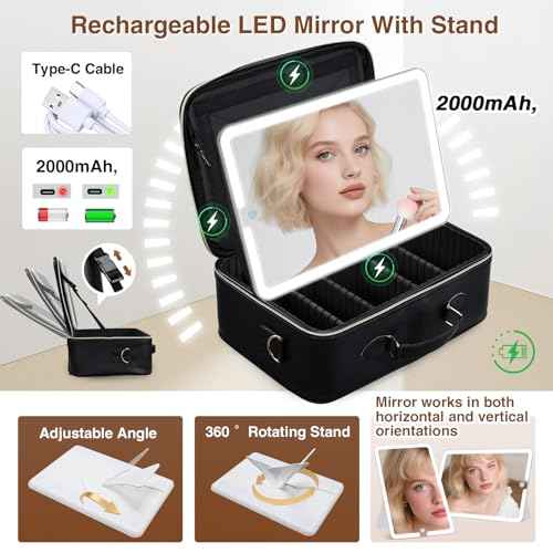 Large Makeup Bag with LED Mirror,Travel Cosmetic Train Case for Makeup Artists,Makeup Organizer Case with Divider Rechargeable Vanity Mirror with 3 Color Lights for Barber,MUA,Nail Tech, Black