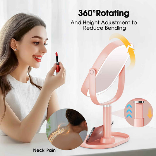 Horyliin Makeup Mirror with Lights - 10x/1x Magnifying Mirror with Light, Rechargeable Desk Mirror with 3-Color Lighting & Memory Function, 360° Adjustable Table Mirror, Gift for Women (Pink)