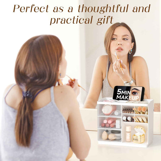 Small Makeup Organizer with Drawers, Stackable Bathroom Couneter Organizer with Phone Holder, Versatile Vanity Organizer Countertop, Cosmetic Organizer for Makeup Brush, Skin Care, Lotion -White,2Pack