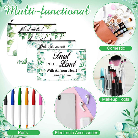Hillban 36 Pcs Christian Gifts for Women Christian Makeup Bag Bible Verse Cosmetic Bag Inspirational Pencil Case with Zipper Green Leaves Travel Organizer Pouch for Cosmetics Makeup Brushes, 12 Styles
