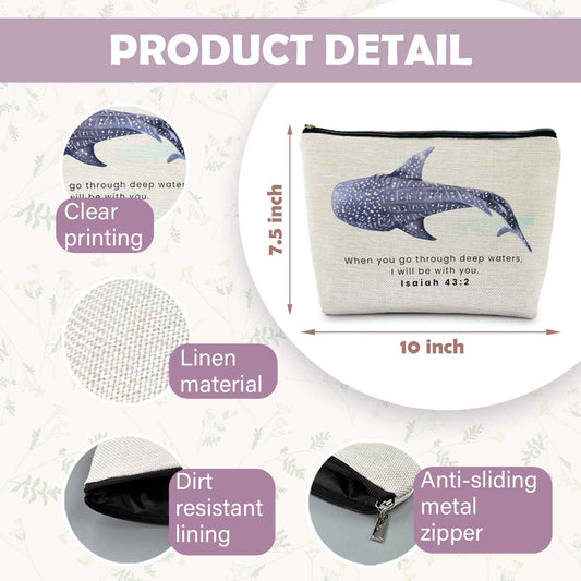 RYYCDOI Whale Shark Christian Makeup Bag Pouch, Christian Shark Gifts for Women, Bible Verse Gifts Isaiah 43:2, When you go through deep waters I will be with you