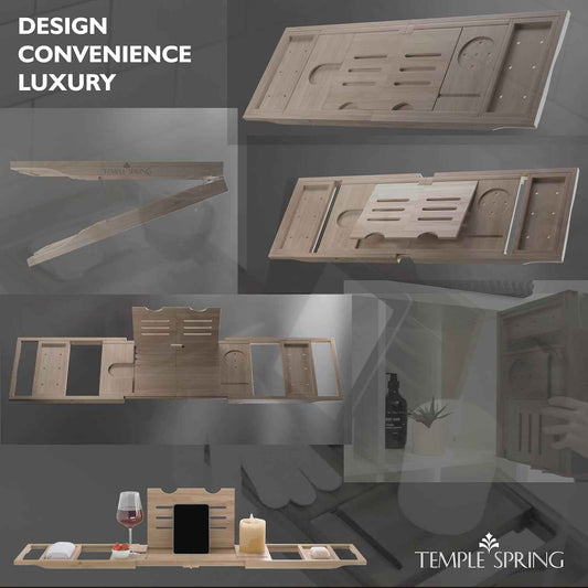 Temple Spring Foldable Bathtub Tray, Unique Design Selfcare Bathroom Caddy, Bamboo Spa Bathroom Tray, Wooden Bathtub Accessories, Wedding Gift/Birthday Gift/New Home Bath Table