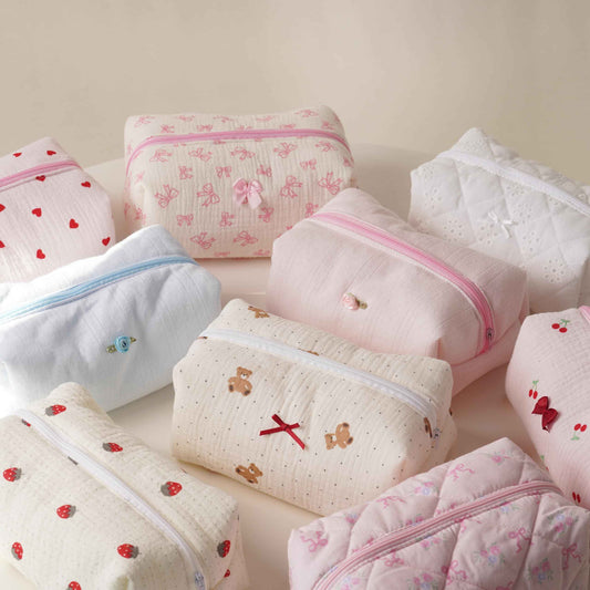 uekeboag Quilted Cotton Makeup Bag,Coquette Quilted Toiletry Bag for Women and Girls,Floral Coquette Pouch,Cute Kawaii Travel Cosmetic Bags(White Bear)