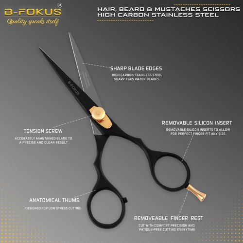 5.5” Hair Cutting Scissors for Hair, Mustache & Beard - Black Mustache and Beard Scissors for All Type Facial Hairs, Beard and Mustache Scissors with Pouch, Tweezers, Beard Comb and Mustache Comb.