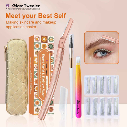 Women's Dermaplane Face & Eyebrow Razor Kit with GlamTweeler Slant Tweezers, Spoolie Brush, and Luxury Leather Storage & Travel Case + 10 Refill Blades (Rose Gold)