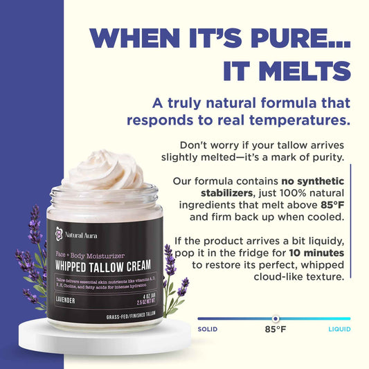 Whipped Beef Tallow for Skin - Face + Body Moisturizer, 100% Grass Fed Grass Finished Tallow and Honey Balm for Dry Skin - Natural Lotion - Free of Harsh Chemicals - 4oz, (Lavender)
