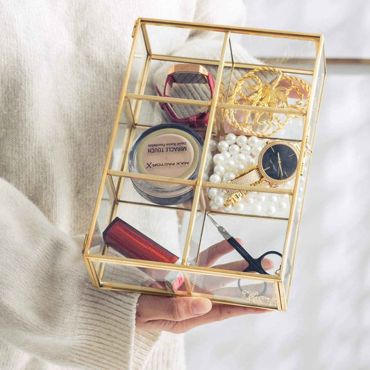 Levilan Golden Vintage Glass Box Clear Glass & Brass Metal Storage Jewelry and Cosmetic Makeup Lipstick Holder Organizer Beauty Display, 6 Compartment