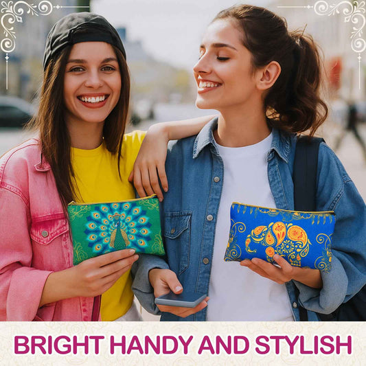 SilTriangle 12 Pcs Diwali Gifts Bulk, Indian Return Gifts for Pooja, Multicolor Canvas Makeup Bags with Golden Zipper, Travel Cosmetic Pouches with Classic Indian Motifs, Wedding Gift for Women