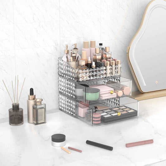Rosoenvi Makeup Organizer for Vanity, Stackable Cosmetics Organizer and Storage, Cosmetic Display Cases with 2 Drawers and 1 Tray for Makeup Brush, Hair Accessories, Lipstick and Jewelry, Clear